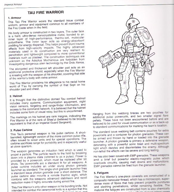 um.... I believe forgeworld already did a twin linked pulse carbine drone before... 2ndly, those versions of the carbine are specific to pathfinders, The pathfinders include on there carbines, hardwired markerlight which is on the top, and a hard wired grenade launcher which is on the bottom http://i302.photobucket.com/albums/nn10 ... C02817.jpgHere is a pulse carbine without the markerlights http://bitzbarn.com/oscommerce/catalog/ ... arbine.JPGBecause we can't make the markerlight, grenade launcher, and pulse carbine ALL the same weapon, don't make the sprite include them all... All a pulse carbine is, is a shorter pulse rifle, and it says as much in both the codex and imperial armor. the ONLY exception, is that pathfinders SPECIFICALLY get a markerlight and grenade launcher mounted. if you get rid of the markerlight and grenade launcher it's the same length as a carbine already is, but its only as tall as a pulse rifle. The Carbine is to the pulse rifle as the uzi is to the assault rifle. what we keep finding, is carbines with all the extras added... give me a minute let me find the imperial armor page I scanned. Oh yes, and they have a thermic sight, how could I forget something so not reflected in the rules or gameplay in any way given that this doesn't help in night-fight due to GW laziness.Also keep in mind that due to GW laziness, the carbines the firewarriors get are Identical to the ones pathfinders get model-wise, because they where to lazy to make a separate mold, AND the only carbine that looks different is on, the gun drone, which STILL includes the grenade launcher for NO REASON. LAZINESS I SAY! Attachment: