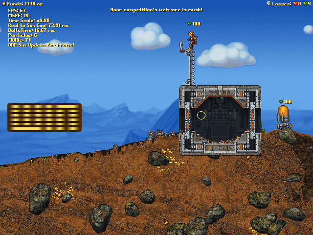 numgun wrote: I have one request guys. Just please, dont make them lag horribly. That is all. I'm finished. 100% finished. This is most likely the best mod I've ever made, and guess what. It runs on 512 MB ram just fine. it is not dependent on any base.rte content, and doesn't copy any references either. also, without showing the gun itself, or the explosion, here's the aftermath of 2 clips (bad aim) (timescale is 0.88 on my machine on the tutorial with no particles. my gun didn't drop it to 0.70 except when an actor was hugging the explosion and absorbed all the particles... that sucked, that dropped to 0.68) I think i'm gonna tweak it though, make the ammo shiny. you know...