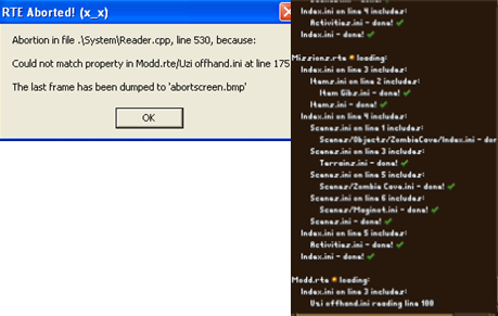 well i know its the mod that let's the game crash soo... Here is the Index.ini It's probably wrong... Code: DataModule ModuleName = Offhand Uzi IncludeFile = Uzi offhand.ini Is it wrong or not?