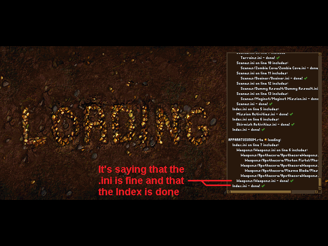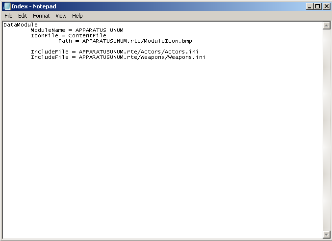 Code: // IncludeFile = AssaultMachUnited.rte/Actors/Apothecore.ini The .rte name is incorrect. Apothecore.ini does not exist. EDIT: sorry if you misunderstood me, I meant IN actors.ini.