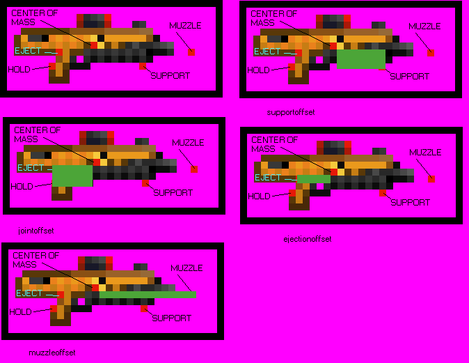Here's an explanation for the offsets you wound up with, when you uploaded your mod. Code: SpriteOffset = Vector X = -12 //the center of mass will be 12 rightward and Y = -5 // 5 downward, from the top left corner of the sprite JointOffset = Vector X = -6 // the primary hand will hold the gun in a position 6 leftward Y = 3 // and 3 downward, from the sprite offset position SupportOffset = Vector X = 7 //the support hand will hold the gun in a position 7 rightward Y = 3 //and 3 downward, from the sprite offset position MuzzleOffset = Vector X = 14 //the muzzle of the device will be in a position 14 rightward Y = 1 // and 1 downward, from the sprite offset position EjectionOffset = Vector X = -5 //the ejection port of the device will be in a position 5 leftward Y = 1 // and 1 downward, from the sprite offset position StanceOffset = Vector X = -12 //when sharp aiming, the FG hand of the operator of the device will be 12 leftward Y = 1 // and one downward, from that arm's joint offset, ei, his shoulder SharpStanceOffset = Vector X = -9 //when not sharp aiming, the FG hand of the operator of the device will be 9 leftward Y = 1 // and one downward, from that arm's joint offset, ei, his shoulder This applies when facing rightward, so holding the gun with a stance 12 or 9 leftward is the most obvious problem. And also, its seems that none of the other offsets are exactly at the positions I'm guessing you wanted them. You could just tweak it to what you want, or leave it as is if it's good enough, but I'd suggest marking off where you want each one on a copy of the sprite, and then following my guide to get them right where you marked them.