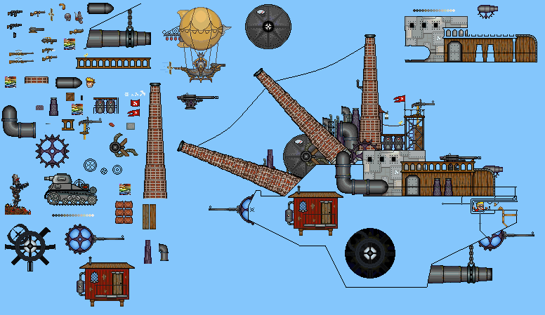 Quote: Ladies and gents, may I present to you the latest advancement in bipedal steam powered walkers, the <Insert cool steamy name here> The <Name> features it's main cannon, that fires high explosive rounds the size of a Dafred's head. Secondary armament includes two autocannons, a flak gun, and a heavy repeater pistole. (HMG up top). Water is taken from the tank at the back (one of it's weak spots), and turned to steam in it's inbuilt boiler. Data, our lucky pilot, is seen here raising his middle finger to the world all the way down there. The main walker is based on a detailed sketch I made during PDHPE a year ago. It should have two stubby but immensely strong reverse jointed legs attached to the big hole there. Obviously, the walker is heavily WIP, I haven't worked on it much. I hope to learn walkpaths and put this in the game. It'll be something like Amrobotics' Flying Fortress. Speaking of Amrobotics, his stuff was of great inspiration to me, so thanks to you, sir. The spritesheet includes individual pieces of the walker, aswell as some weapons, a War Balloon, and a Tank. When finished, the walker will have a null dropship attached to it, and will be able to drop tanks and infantry from its... Rear end. The parachuted Steam Panzer is of the 71st Air Panzer division (Airborne Armour Corps) and is a driven by a single trooper. The war balloon is just random. If I left anything out, I'll edit it in later. Attachment: