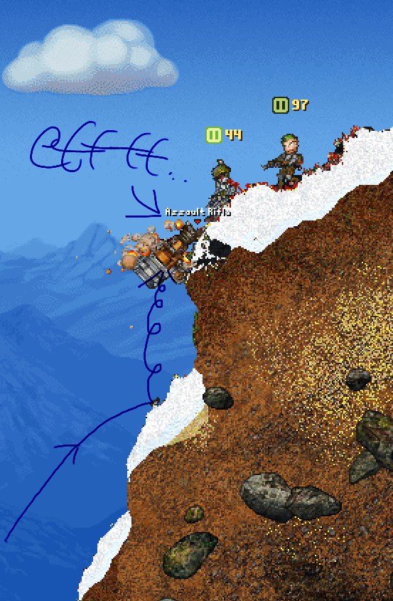As Ricky said to Lucy, I "got some 'splainin' to do". The colours are an indication of time, basically step 1, 2, 3. The story here is that I shot down a dropship mk1 about half a screen away - comfortable distance, nothing out of the ordinary. However, the engine takes some damage, and it gets juuust enough horizontal movement to do two flips and land on the plateau where I
