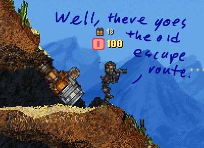 All these pictures were taken while playing the One-Man Army scenario, slightly modified to give me a robot and double-power jetpacks. This is because I got tired of playing a soldier who couldn't get up small hills. For example, the robot can fly after he's picked up a few light guns, but not after he's picked up one gatling gun. The initial weapons are the same as in vanilla CC, however. Nothing else has been changed, but... what an improvement! ... Oh, right, the humorous pictures!