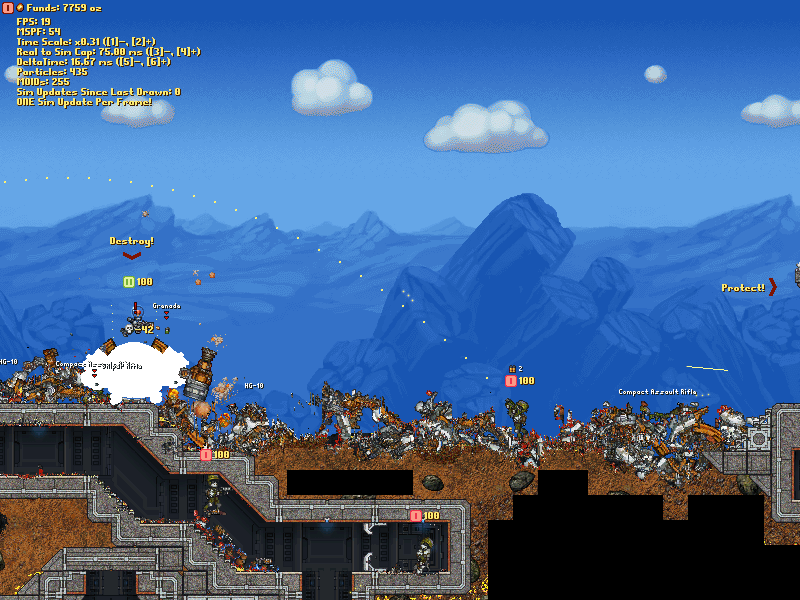 Considering there's only 255 pointers, when it goes above this the Lua pointers get voided and weird ♥♥♥♥ starts happening. Will bug data to remove moid limit, although that'd remove crab bombs too... Wait that can be removed easily and it's not some unfortunate limitation of the game? So why is it still here? crab bombs alone don't make up for all the screwups it causes. Anyway, for anyone who doesn't like having the ai break the moid limit I'd suggest replacing line 738 of Metafight.lua (in base.rte/Activities) with the following: Code: if self:PlayerActive(player) and not self:PlayerHuman(player) and self.TeamAIActive[self:GetTeamOfPlayer(player)] and self:GetPlayerBrain(player) and MovableMan:GetMOIDCount() <= rte.MOIDCountMax then rte.MOIDCountMax is set to 210 as default, so I went with that but it can of course safely be anything up to around 240 or so (less than 255 to keep it from going over when people pop out of dropships).