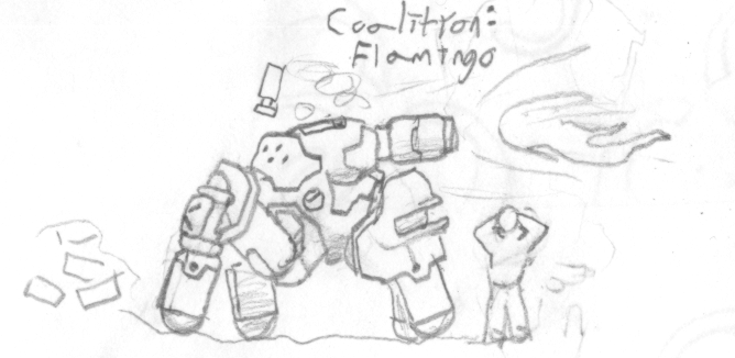 On topic: I'm really digging the style of this Dropship, and I intend to thoroughly and repeatedly smash into opposing troops with it, just for the fun of it. I'm glad you like the aesthetic. I know it looks mean enough you just HAVE to use it to kamikaze things. I took a break from gibbing to sketch something. I'd love to hear what you guys think. I intend to keep it within CC balance terms (that means no giganto-epicness.) That doesn't mean that cannon won't be appropriately devastating, however. Brainstorming a name atm. I don't want to give it something overly dramatic like "Destructolator," "Opressor" or somesuch. I'm trying for a good military-esque name, hence a name as innocuous as Flamingo.