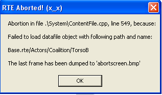 Abortion in file .\System\ContentFile.cpp, line 549, because: Failed to load datafile object with following path and name: Base.rte/Actors/Coalition/TorsoB The last frame has been dumped to 'abortscrren.bmp'
