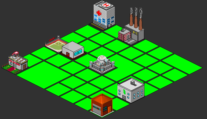 I feel like I'm straddling the line between isometric and just a sprite with this. Idea for this game, roads. roads are the lifeblood of any city, they would cut up the district into blocks and limit (aside from a hefty fee of paving a new road around the building) building placement -> More organized, and more city like.