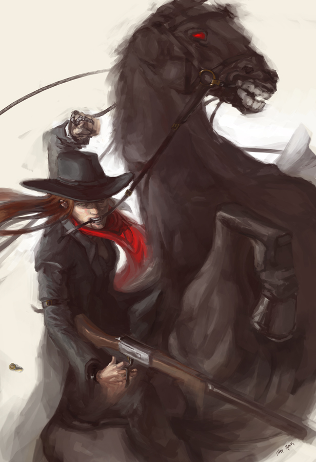Adriaan wrote: That is awesome. Love the lever action on the rifle! Here's some nitpicking: it looks like the lighting on the casing might be upside down, with the brightly lit part on the bottom and the only slightly lit part on top. I'm not sure if it should be like that? the horse is rearing up at an angle, the sunlight is getting under it.