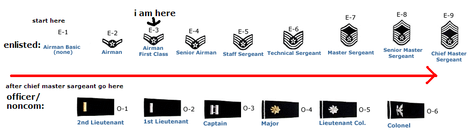 I am a freshman, and as of today, my rank is Airman First Class. The attached image shows my placement on the rank hierarchy of the AFJROTC.