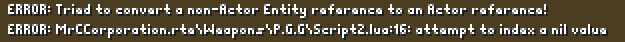 The first one you can do it using .ini. Just give spread to the particles that pushes the emitter (rocket). The second one isn't hard, but I haven't got any reliable methods for checking the parent, so this might simply result laggy: Code: function Create(self) self.ActorThatCanHoldThisWeapon = "Name of the Actor that can hold the weapon" self.parent = MovableMan:GetMOFromID(self.RootID) end