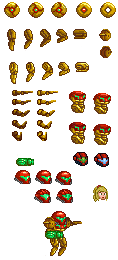 EDIT: Samus is all but finished, I need to make her hands and animate her feet. I have a few helmets here, you can kinda see her eyes in a few of them, I used the Corruption and Super Metroid versions of the helmet, I kinda prefer the latter. I saw a few small problems when I put her together down at the bottom. Also, I outlined her arms when I put her together at the bottom. I usually don't put black outlines on sprites, it takes away from some of the coloring, and I won't on the final version here because she'll be moving in the game. As a static image her colors blend a bit and it didn't look right unless I did that. Shoulder pads for the Varia suit are included, I just don't know how they're going to be attached yet (as part of the arm sprites, as a separate item over the arms)... That said. Here's what I have. Let me know what you think.