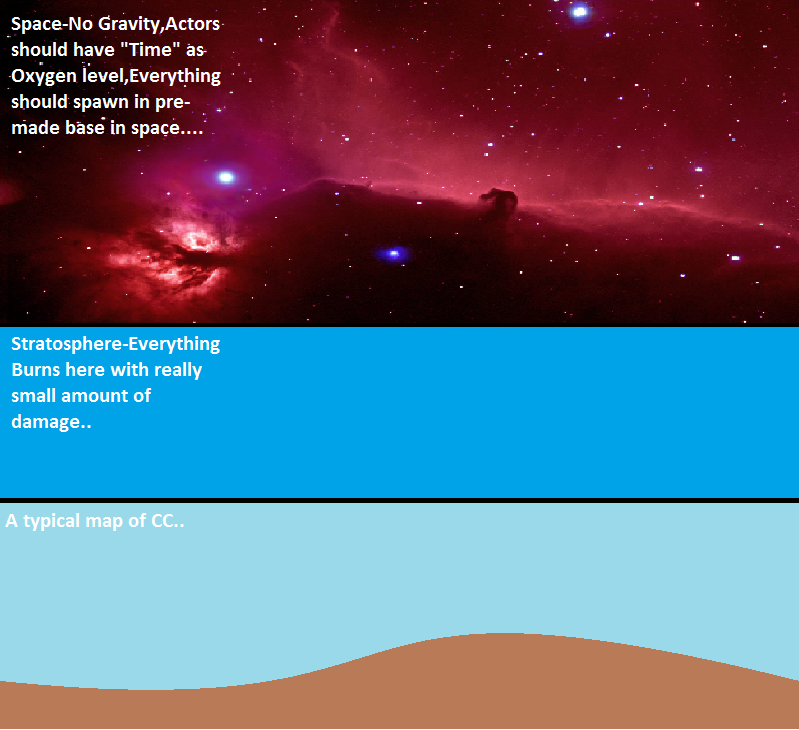 So basically,the map would be alot more enjoyable,this should also bring space wars (that would be absoultely insane to fight,but why not?) also if you want to defeat oposites brain,you have to travel some route to it....i think it would be more realistic addition to CC,and you can coordinate your ships as you want as well,you can load drop pods as you want,they have to pass trought stratosphere,so shields will be now more useful...and alot more fun... Simple map,nothing special,but had some issues with constructing this one,normal CC map sector and Space was succesfull,but i cant figure out,how to do "Stratosphere" sector,so every actor wich will pass trought this will start burn (i mean just effect of burn with really small amount of damage) Thanks for reply and reading this,hope you like my idea.... And also thanks for your help..