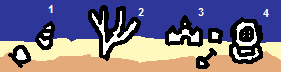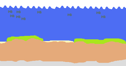 Instead of a sky, the background is filled with a nice blue color, and clouds are replaced with schools of fish. Dirt is replaced with sand and mud. Regular plants are all replaced with sea plants. Various sea-stuff sprinkled on the ground 1: sea shells, 2: lots of coral reefs, 3: sand castles, 4: diving helmets. Attachment: