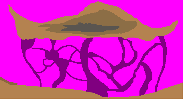 The black is terrain, the purple is the background texture. Where I've put the lines you might want to think about doing that spindly background thing like what you did in Craetern.