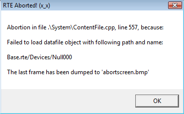 This is some example code, but it shows you Framecount. Just search the .ini file for "FrameCount" until you find the one referencing Base.rte/Devices/Null.bmp, change it to Base.rte/Null.bmp (it's not in the Devices folder anymore), and change the Framecount to 1. Hope this helps.