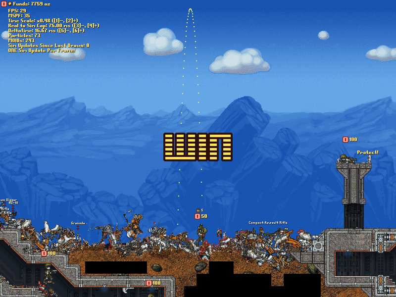 Considering there's only 255 pointers, when it goes above this the Lua pointers get voided and weird ♥♥♥♥ starts happening. Will bug data to remove moid limit, although that'd remove crab bombs too... Wait that can be removed easily and it's not some unfortunate limitation of the game? So why is it still here? crab bombs alone don't make up for all the screwups it causes. Anyway, for anyone who doesn't like having the ai break the moid limit I'd suggest replacing line 738 of Metafight.lua (in base.rte/Activities) with the following: Code: if self:PlayerActive(player) and not self:PlayerHuman(player) and self.TeamAIActive[self:GetTeamOfPlayer(player)] and self:GetPlayerBrain(player) and MovableMan:GetMOIDCount() <= rte.MOIDCountMax then rte.MOIDCountMax is set to 210 as default, so I went with that but it can of course safely be anything up to around 240 or so (less than 255 to keep it from going over when people pop out of dropships).