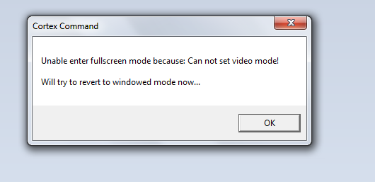 This might have been posted already, but I am a very impatient nooblet, so I'll hope some kind soul takes pity upon me. Whenever I attempt to run the game in full screen (using the alt+enter) I get this message, and then it reverts to windowed, with a bunch of black (that clears if I can shoot it, strangely). I'm no code monkey and this game on my previous computer worked without a hitch (that was a few builds ago) so I'm kind of at a loss as what to do aside from manually adjust the aspect ratio to that of my desktop.