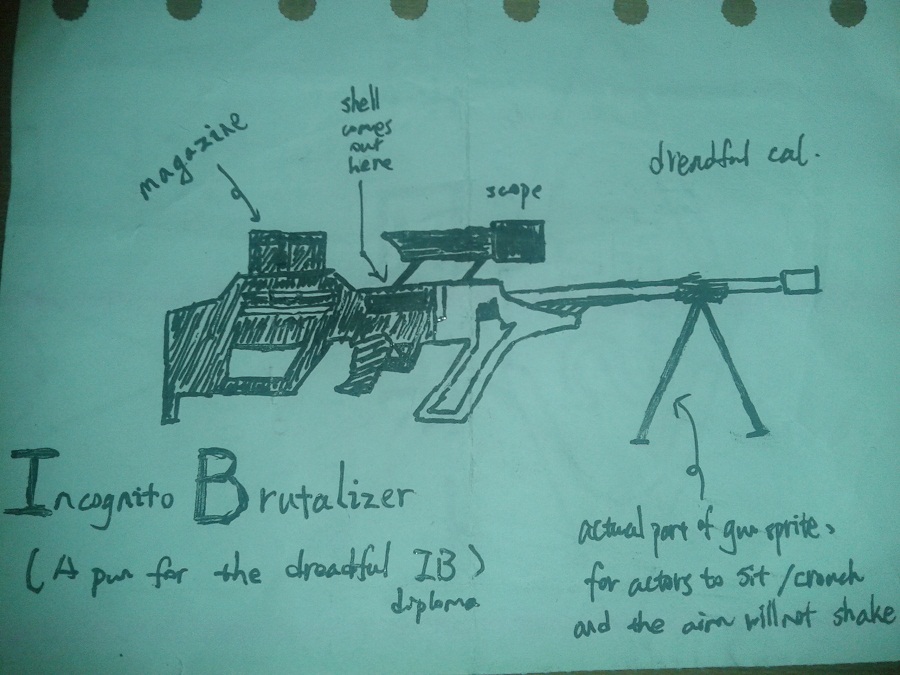Being a huge sniper fan, I sketched this bad boy (below) for a possible dummy sniper rifle, at the price of 400oz, probs? Nothing proves more advantageous than range, does it not?